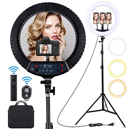- 【What You Will Get】1 x 18 inch LED Ring Light, 1 x Ring Light Stand, 2 x Adjustable Phone Holder, 1 xTripod Head , 1 x Phone/Camera Holder, 1 xBluetooth Shutter, 1 x IR Remote Control, 1 x Power Cord, 1 x Carry Bag, 1 x User Manual. 18-Month warranty for refund or replacement.