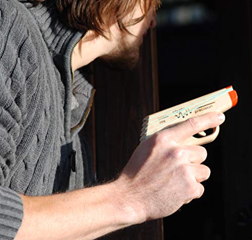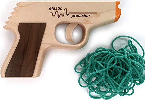 Details: Product Description FUN FOR ALL AGES FOR THE YOUNG - Unplug a kid near you and make them go outside and play! These rubber band guns are sure to spark young imaginations. Share the fun you had as a kid with the next generation. FOR THE YOUNG AT HEART - Wish these were around when you were a kid? Now you can relive the good old days but this time make them better with a semi-automatic rubber band gun! You deserve an upgrade! Made from a solid piece of hard rock maple and based on the classic PPK made famous by James Bond, this beauty semi-automatically fires 5 bands in under 2 seconds and reloads faster than any other rubber band gun on the market. Elastic Precision rubber band guns offer the ultimate in fun and performance and are built to last for generations. We only use the finest hardwoods like hard rock maple - the same wood used to make bowling pins and major league baseball bats. You'll never find cheap pine, plywood or plastic pieces here. Features: Fun for all ages and makes a great gift for kids both young and old Modeled after the classic PPK handgun Made from solid hard rock maple. No plastic pieces! Semi-Automatically fires 5 rubber bands in under 2 seconds Comes with ammo and instructions Easy to load and shoot Dimensions: 5.5" long x 3.6" tall x .8" wide