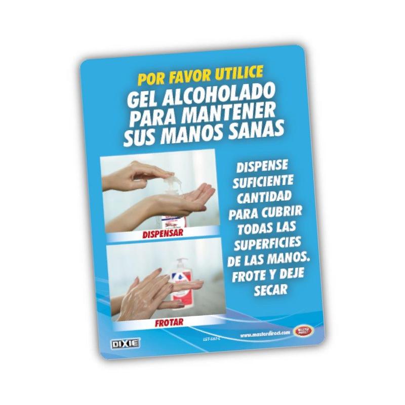 Tamaño: 9 X 12 Pulgadas (23 X 30 Cm). Hechos de plástico PVC de 3 mm con cintas de tape doble contacto en el reverso para pegarlas a la pared. Durables y resistentes al agua y salpicaduras. Recomendados para uso en interiores y colocarlos en lugares en donde se desee recordar a las personas la importancia del uso del gel alcoholado.