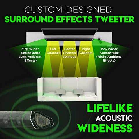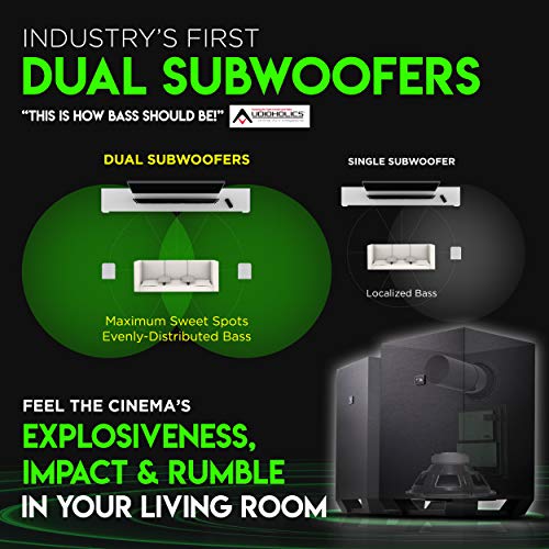 - Our DUAL 10" WIRELESS SUBWOOFERS (industry's 1st!), the new soundbar reference standard for bass, produce ground-shaking rumbles that turn your living room into an epicenter of adrenaline-pumping action. They merge to distribute bass evenly throughout the room with zero localization. The sound bar, surrounds and subwoofers replicate the perfect theater experience, reaching cinema-level volumes with no distortion. Agreed among experts, TWO subwoofers are a must for ultimate home theaters.