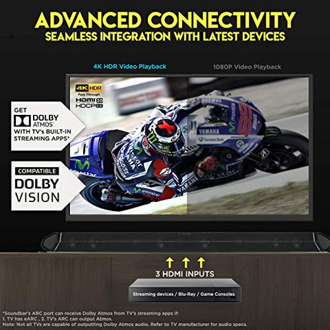 - All units sold since Aug '19 can receive Dolby Atmos surround via TV’s eARC when streaming with TV’s smart apps like Netflix (Note: not all TVs can output Atmos. Refer to your TV brand’s audio output specs). Enjoy advanced connectivity with Dolby Vision, 4K UHD pass-thru and High Dynamic Range (HDR). Connect up to 6 devices via 1 HDMI ARC, 3 HDMI, 1 Optical and 1 Coaxial inputs. The 52-key backlit remote allows seamless control of sources, DSP modes, individual channel and room size optimization