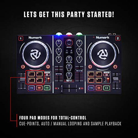 Details: Let’s Get This Party Started! There ain’t no party like a Party Mix Party! Ultra-portable and packed with all critical DJ tools, Party Mix is an amazing DJ controller featuring effortless connection directly to your Mac or PC, letting you browse, play and mix all of your favorite songs with the included Serato DJ Lite software. What really sets Party Mix apart from every run-of-the-mill controller out there is its electrifying light show – yep, you heard us, three room-filling LED light arrays auto-sync to your mix, flashing from the back of the Party Mix, illuminating your performance. With a built-in sound card plus all the essential controls the modern DJ demands you can take command of your mix with 2 jog wheels, sync / cue / play buttons, a crossfader, four responsive performance pads for total-control of cue-points, auto / manual looping and sample playback and keep your mix on point with on-board headphone cueing. Become the DJ and make your next party utterly unforgettable with Party Mix – trust us, you won’t be disappointed! Dazzling Light Show Take your party to the next level and amaze your friends and family with your DJ skills. With Party Mix’s built-in light show, you will shower the room with colorful light patterns, creating the perfect party atmosphere! Plus the lights auto-sync to your music so you can focus on what’s important – your ultimate party set! On-Board Audio Interface Make complicated setups a thing of the past with Party Mix. With an on-board, pro-grade audio interface plus a dedicated 1/8-inch headphone output and 1/8-inch main output, keep your mix on point and seamlessly connect to virtually all mixers, powered speakers and audio recorders. Mix Control At Numark, we know core control forms the beating heart of any DJ Set – that’s why we packed Party Mix with all the must-have mix essentials you demand. With two channels, outfitted with a crossfader, jog-wheels and pitch faders, access to critical, must-have tools for seamless blending are right at your fingertips! Add Some Flair Don’t let the small size fool you— this controller packs a punch when it comes to performance enhancing controls! With four pad modes for total-control of cue-points, auto / manual looping and sample playback, Party Mix gives you access to performance controls typically found on larger controllers. Style Driven, Ultra-Portable At Numark, we know the modern DJ demands their setup is portable, robust and style-driven. With a sleek low-profile design and radiant backlit controls, it looks great and is made to move! What’s more, it’s powered over USB and supports plug-and-play connectivity for maximum portability and effortless integration! Serato DJ Lite Included Jump straight into action and kick off your party, Numark Style! Party Mix comes pre-mapped with the intuitive, reliable & feature rich Serato DJ Lite for Mac & PC (included) - it's everything you need to learn how to DJ!